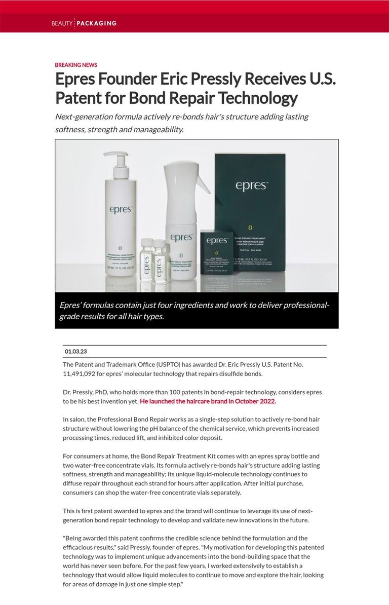 "Epres Founder Eric Pressly Receives U.S. Patent for Bond Repair Technology" by Beauty Packaging