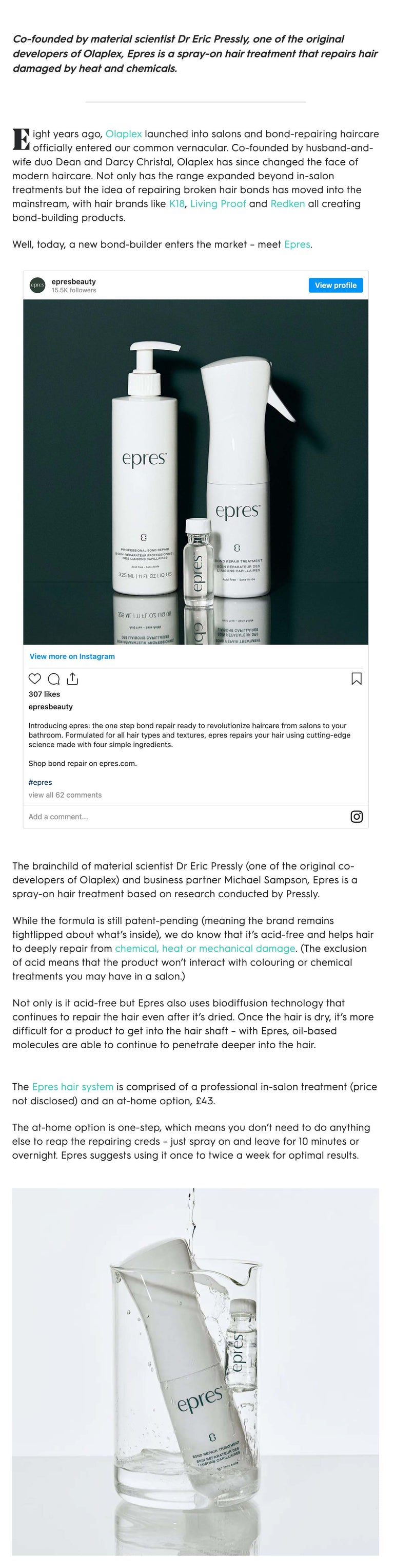 "Epres is a one-step bond-repairing spray that heals damaged hair at home, created by the scientist who created Olaplex" by Morgan Fargo